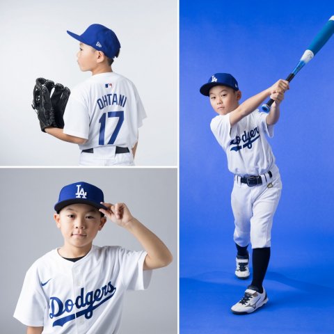 実は若葉でドジャースのキッズ用帽子とユニフォームのレプリカを用意しているんです。ご希望でサイズが合うお子さんに着用してもらって撮影しています。今回は実際に野球チームで頑張っている本人がグローブやバットなど持参してくれましたので、それに合わせて撮影となりました。バットを構えると目力が強くなるのにびっくりしました💦