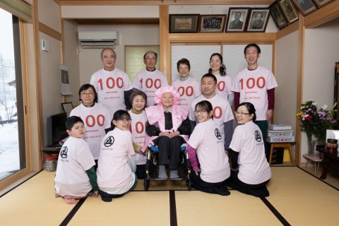 当日は残念ながらまさかの雪😨で外では撮れなかったのですが、お家の和室で、お揃いのオリジナルTシャツで撮らせていただきました。背中には家紋まで入っているメモリアルTシャツです。孫、曽孫に囲まれて穏やかな表情の100歳さんでした。