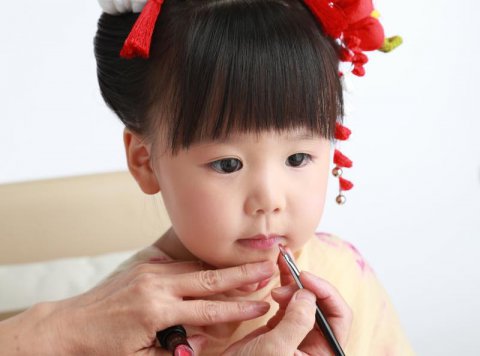 ほとんどの女の子は七五三で初めてお化粧体験することになります。ときどきママの化粧ポーチを開けて、こっそりお化粧の真似事をしていたというお話もよく聞きます😊 三歳さんは新日本髪を結い上げた後、うすーく頬紅をして、口紅をさっとぬります。最近はグロスタイプのものでうっすら色づくリップにしていますが、美容師さんに口紅を塗ってもらう時の表情はとても可愛いものです。小さくてもしっかり女子なんだな〜と思う瞬間です。