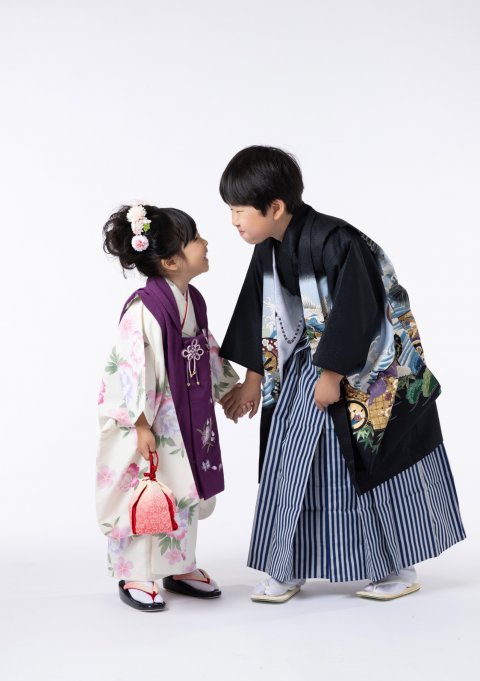 ひとりポーズの写真はドキドキ💓でもお兄ちゃんと一緒なら安心😊しっかり者のお兄ちゃんは優しく妹ちゃんをささえてくれます。お着物にお着替えの時には見守ってくれて、一人のポーズの時には優しく声をかけて、時には笑かし隊となって笑顔を引き出してくれました。七五三では兄弟、姉妹のお写真もオススメしています。小さい頃の思い出は成人された後も懐かしい出来事として心に残ってくれることでしょう。