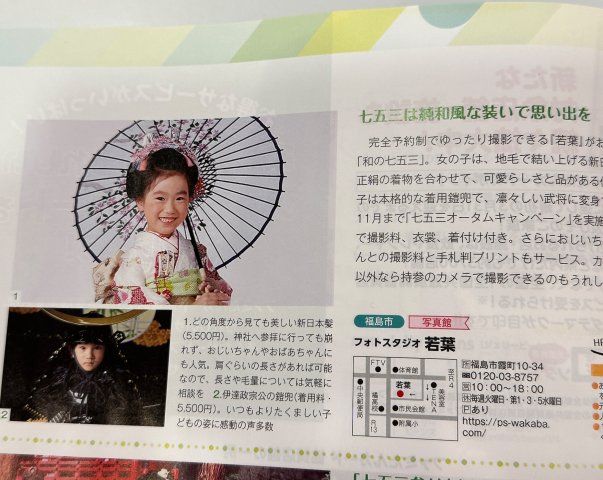 さて、本日発売のCJ monmoに若葉の七五三記事が掲載されています。福島の子育て特集ページで、若葉がお勧めする和の七五三をご紹介しています。正絹のお着物に新日本髪、武将になれる鎧兜が体験できるのは若葉だけです。もちろんプリンセスドレスなどの洋装もご用意していますよ。秋本番に撮影してお参りなど検討されている方はぜひお気軽に「七五三の相談なんですけど」とお電話くださいね。