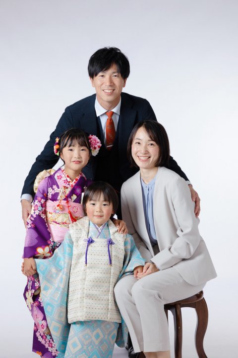七五三ではお子さん一人の撮影だけではなく家族のカットもおすすめしています。スマートフォンやご自宅のカメラだと誰かが写っていなかったり目線がバラバラだったりと、なかなかうまく撮れないというお話をよく聞きます。きちんとした「これぞ写真館!」といった家族写真もいいですが、せっかくならみんなくっついた仲良しのカットも若葉ではおすすめです。 家族がつながる家族写真っていいですよ。