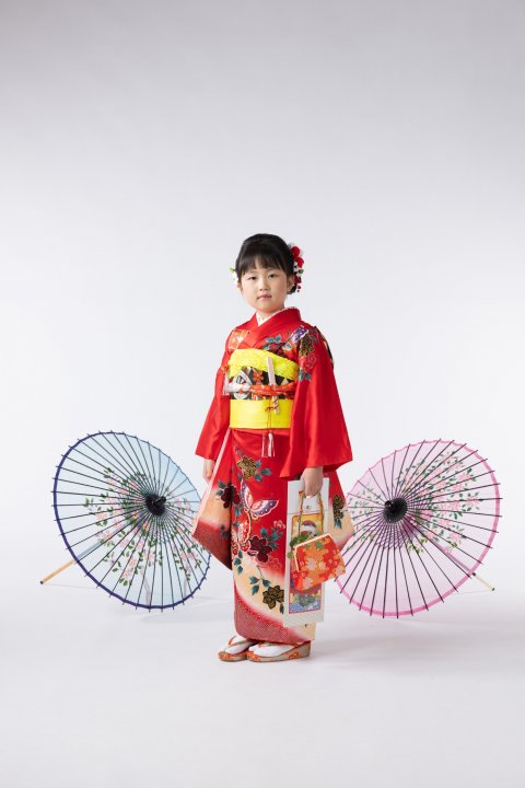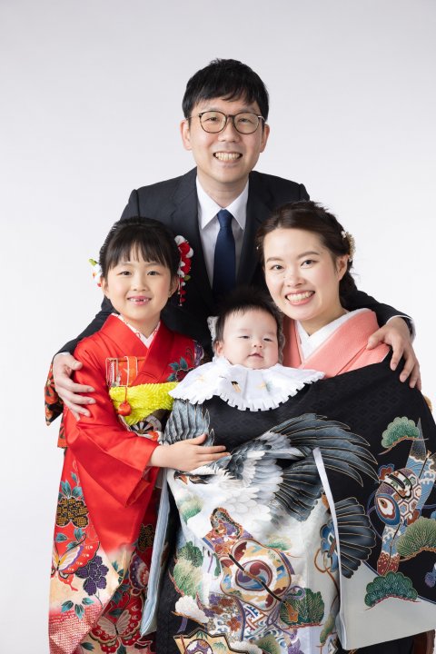 お姉ちゃんの七五三に合わせて赤ちゃんのお宮参りのお祝いです。ママが着用した思い出のお着物に若葉の小物を合わせました。ママも素敵な着物姿になったのでお姉ちゃんも嬉しそうでした。お子さんたちの一人ずつのお写真の後はみんなでぎゅーっと密着! 家族みんながつながるお祝いのお写真です。お部屋に飾ったら毎日見るたびに幸せな気持ちになることでしょう。