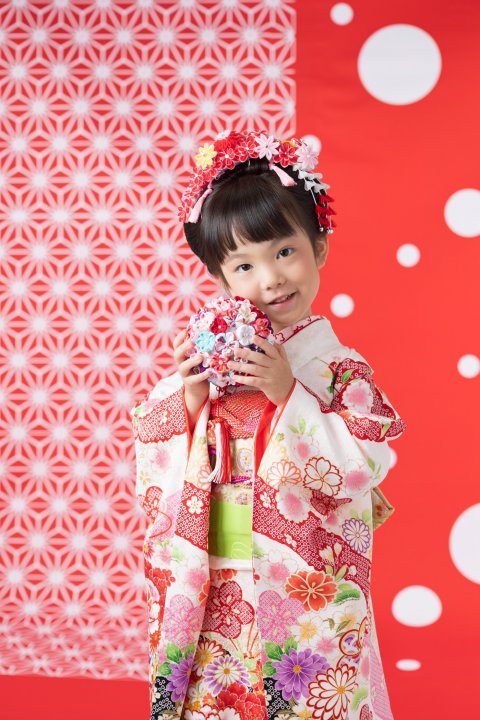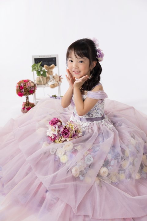 7歳さんにもなると色の好みがはっきりしてきたり、着物だけじゃなくドレスも着た〜い♡というご希望がほとんどです。神社にお参りを予定している場合は別日にドレスの撮影をお願いしています。お参りの日は着物のお支度の後に撮影して、ご家族で神社にお出かけしていただきます。ドレスの時はくるふわヘアーを楽しんで、着物でお出かけの日はお参り用に新日本髪もいいですよ。