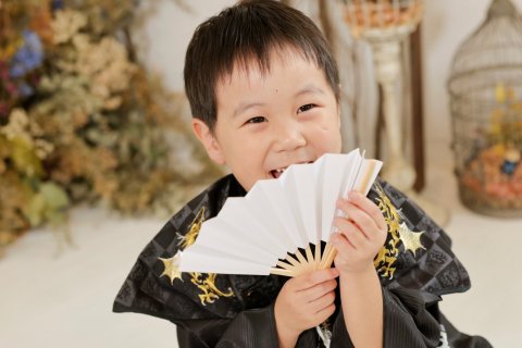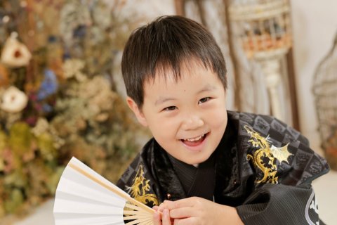 男の子の袴姿では羽織の房や懐剣、扇子などの小物があります。どれもお子さんにとっては初めてのモノばかりで「これな〜に?」なんて聞かれることもあります。その中でもお扇子は「持ってみたい開いてみたい」と興味津々。