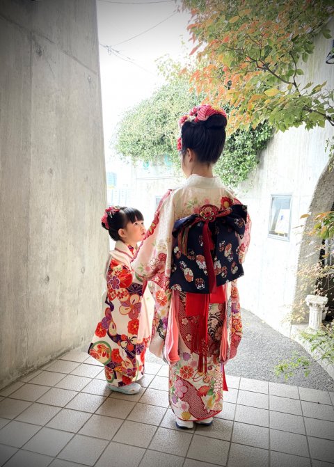 今日のお客様は可愛い姉妹(3歳&7歳)二人とも正絹のお着物に新日本髪スタイルです。歩くたびにかんざしが揺れて雅な雰囲気💕です。きっと神社でも一番可愛い着物姿だったに違いありません。