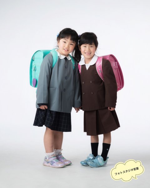 いとこ同士で入学記念写真も楽しいです。仲良しの二人はランドセルの色の好みも制服も違ってて、こちらも見ていてほっこりします。 撮影している時もとっても嬉しそうで、女の子特有の「キャハ💕」っという声がスタジオ中に響いたのでした。