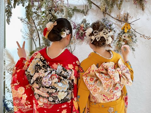 今回の成人式前撮りは、小さい頃からのお友達同士なので振袖姿も一緒に撮りたいというご希望でした。少し時間差をつけてお支度して、二人一緒のカットを撮らせていただきました。20のバルーンを持ったり、きちんとポージングして並んだり、帯結び、ヘアースタイルなどスナップもたくさん撮って楽しんでくださいました。 それぞれに個性があって、見ている方も華やかな雰囲気に嬉しくなりました。成人式当日も楽しみですね😀