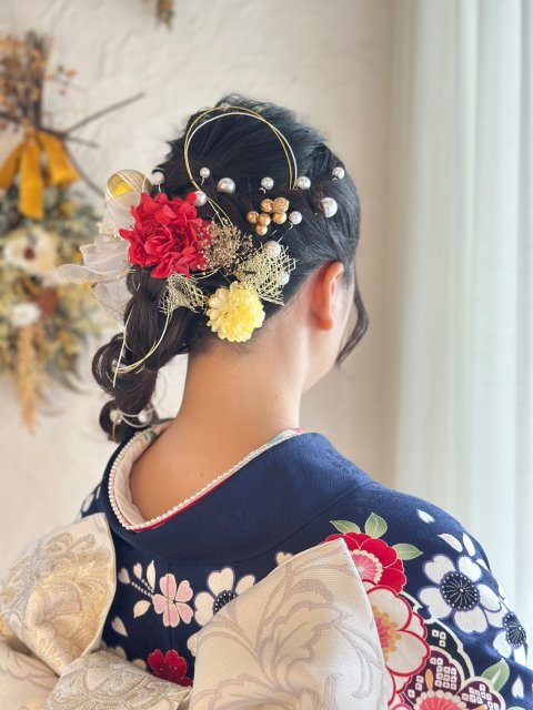 今シーズンも髪飾りでは水引きや金箔が人気です。ヘアーメイクの先生が形よく動きのある水引きにしてくださるので、シンプルなヘアースタイルでも華やかになります。