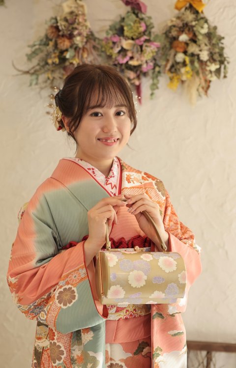 前撮り後撮りではオプションでママ振袖と若葉のレンタル振袖の2着で撮影することもできます。ママ振袖かレンタルか迷っているならどちらも着るのもイイですよ。前撮りは若葉のレンタル振袖で、成人式当日はママ振袖で出席というパターンもあります。