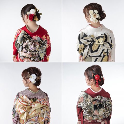 成人式は特別な体験だからこそ髪型や帯結びなど楽しみたいですよね。ヘアースタイルはシニヨンや編み下ろしなど、その年によって流行はちょっとずつ変わります。編み込みスタイルは髪の色を少し明るめにしてもいいと思います。黒っぽいと編み込んだところが分かりずらいので塊のように写ってしまうこともあるからです。実習や就活などで髪の毛を暗めにしなければいけない場合は、前撮りの時期を早めにするのもおすすめです。