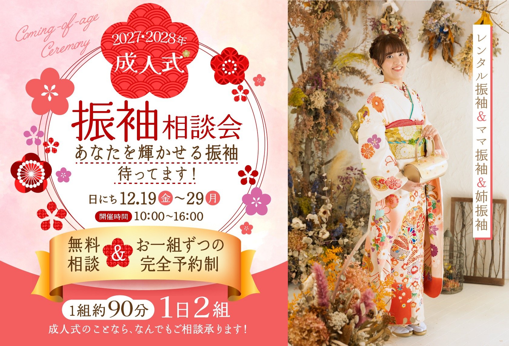成人式はレンタル振袖をお考えの方、ママ振袖に小物だけレンタルしたい方、写真だけは残しておきたいと思っている方など、成人式に関するご相談承ります!