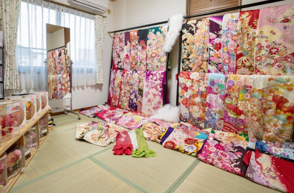 「成人式のレンタル振袖や小物がいつでもご覧いただけるように…」と衣装ルームを作りました。とても小さなお部屋ですが、京都から仕入れた振袖や髪飾り、帯や帯締めなどを展示しています。可愛いものばかりを集めた宝箱をイメージしたので「Cobaco こばこ」と名付けました。