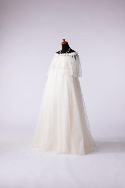 今回入荷したのは、スカート部分が上げ下げできてお腹を出しても隠してもどちらにも対応できます。さらに!二の腕を隠したい場合はチュールのケープもありますよ。アイボリーの優しい雰囲気でオススメです!