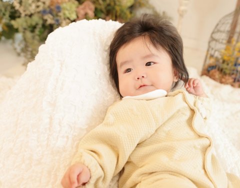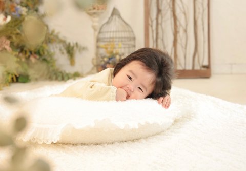 スタッフが声をかけると優しいお顔でお話(赤ちゃん語)してくれます。お家でお姉ちゃん達がたくさん話しかけてあげてるのでしょう。いろんな表情を見せてくれました。 首の力も強くなって、うつ伏せにも挑戦しました。おててもお口も可愛いね。 だいぶ暖かくなってきましたので、赤ちゃん写真を残すのには良い季節です。若葉では自然光のお写真も人気があるカットの1つです。