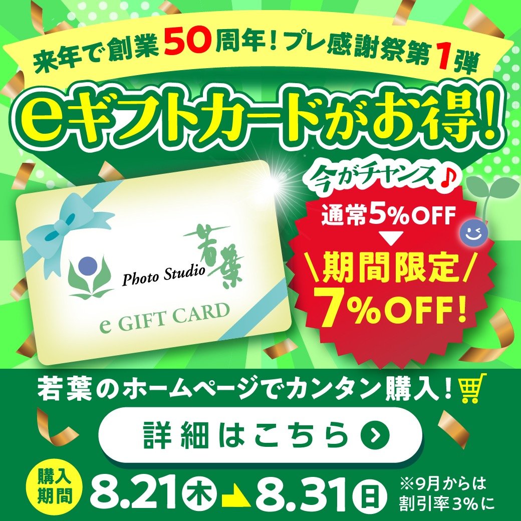 若葉創立50周年を迎える前のプレ感謝祭企画「eギフトカード期間限定7%OFF」 いよいよ購入期間が31日までとなりました。 若葉での撮影料やプリント料、そしてプレゼントとしても使える若葉のデジタル商品券は未来撮影券です。購入制限や期限もありませんので今購入しておいて、先々の撮影にも使えます。 9月からは割引率が3%になるので、今がチャンス😆 ギフトカードを使ってお得に撮影を楽しんでくださいね。 ホームページのトップにご案内のバナーがありますのでご覧ください。