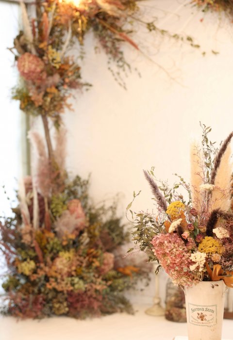 暖かくなるとスタジオ玄関にある定家葛を背景に撮るカットがオススメですが、入り口にあるドライフラワーで装飾した撮影コーナーも人気です。お花屋さん(ブルームさん)に装飾していただいて2回目になります。いつも素敵なアレンジをしてくださるので、撮る方も楽しみなんです。スタジオ内で撮るカットとはまた違った雰囲気で成人式前撮りや花嫁さん、マタニティフォトなどで喜んでいただいています。ドライなので、日が経つとポロポロ落ちてくるため、季節ごとにまたアレンジを変えていく予定です。