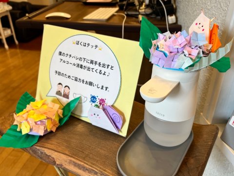 良いお天気も今日まで。明日から雨の予報ですね🌧️ 梅雨の時期に合わせて、店頭の消毒機もお着替えしました。紫陽花とカタツムリでお客様をお迎えします! スタッフ総出で折り紙で作りました😀紫陽花の花は小さくて折るのがとても大変そうでした(私は不器用なため見ているだけ😰) まさかカタツムリまで折り紙で作ったとは!!スタッフの器用さにただただ感心するだけでした💦 ご来店の際にはぜひご覧くださいね。