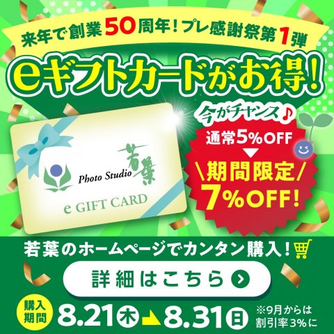 実は来年フォトスタジオ若葉は創業50周年を迎えます。今年はプレ感謝祭ということで、通常は5%OFF(例:50,000円分のギフトカード→47,500円)で買えるところ、8月21日(木)から31日(日)までの11日間限定でなんと!!! 7%OFF😆👍 50,000円分のギフトカードが46,500円でご購入できます。