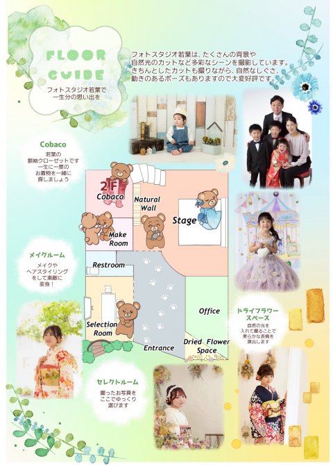 若葉の頼れるスタッフMIRAIちゃんにフロアガイドを作ってもらいました。優しい色合いで、説明してくれるクマさんも可愛い〜💕