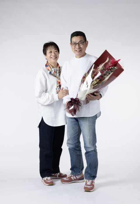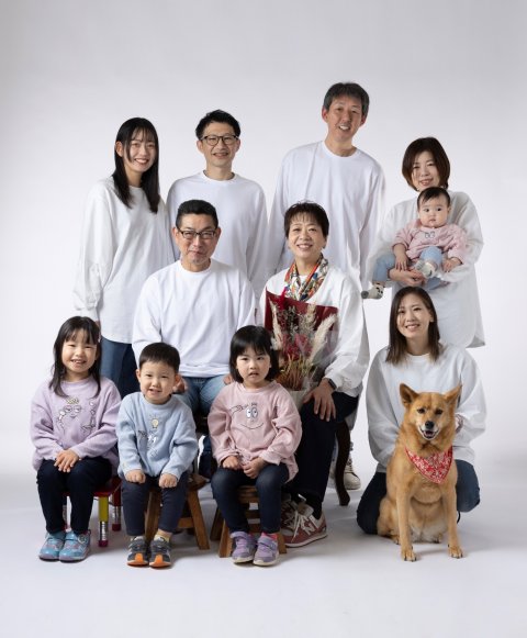 還暦記念のお祝いでご家族揃ってお越しいただきました。お子さんやお孫さんやワンちゃんも勢揃いして賑やかな家族写真になりました。家族みんなの予定を合わせるのは大変だったことでしょう。わざわざお時間を作って若葉にお越しいただいて本当にありがとうございます。 夫婦お揃いのシューズにお祝いの花束で赤を効かせて笑顔の素敵なご夫妻。ずっとずっとお幸せに…😊