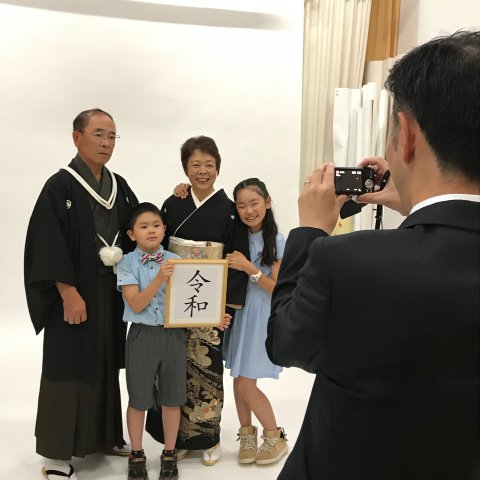 ご主人の70歳記念で家族写真を撮りました。娘さんたちの提案でご夫妻は羽織袴と留袖です。家族みんなで記念写真を撮った後はお孫さんともスナップタイム。「せっかくだから令和でね〜」とお孫さんたちに令和の額をもってもらい今年のご挨拶状かな〜?