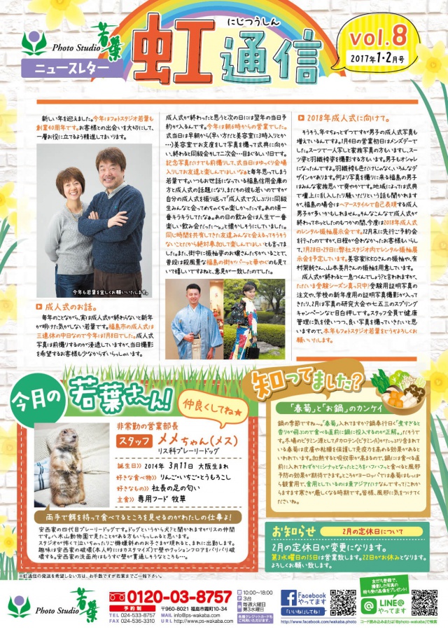 フォトスタジオ若葉の「虹通信」vol.8(2017年1・2月号)を虹会員のみなさんへ郵送いたしました。